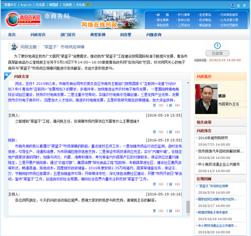 ?。ǘ┘訌?qiáng)與群眾溝通交流。局領(lǐng)導(dǎo)通過“三民活動”、“行風(fēng)在線”、“在線問政”等活動加強(qiáng)與公眾的互動交流,全年參與在線交流活動8次。一是將“行風(fēng)在線”作為政民溝通的重要渠道。局主要領(lǐng)導(dǎo)和局分管領(lǐng)導(dǎo)分別以“創(chuàng)新發(fā)展跨境電商綜試區(qū)”、“以農(nóng)村電子商務(wù)為載體推動‘菜籃子’市場供應(yīng)工作”和“以示范建設(shè)為引領(lǐng),加快推進(jìn)我市農(nóng)村電商‘515+X’工程”為主題參加《行風(fēng)在線》訪談節(jié)目,聽取市民意見,與市民互動交流。二是積極開展“網(wǎng)絡(luò)在線問政”組織工作。圍繞“聽民意、解民憂、聚民智、惠民生”的工作宗旨,全年組織5場“網(wǎng)絡(luò)在線問政”專場,對2016年青島城市購物節(jié)、“菜籃子”市場供應(yīng)等工作與網(wǎng)民進(jìn)行了溝通,其中“菜籃子”市場供應(yīng)被評為優(yōu)秀場次。
