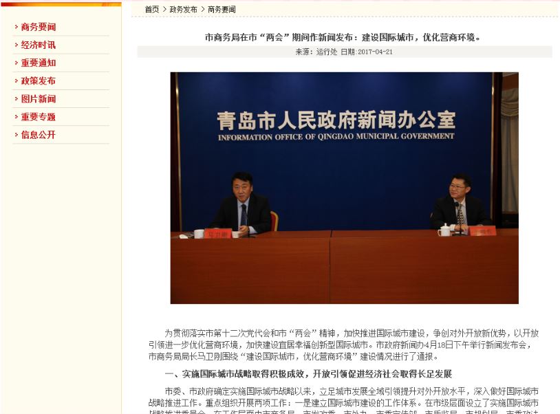 2.充分發(fā)揮報(bào)紙、廣播、電視、網(wǎng)絡(luò)等媒體作用,主動(dòng)發(fā)布信息,使主流聲音和權(quán)威準(zhǔn)確的政務(wù)信息在網(wǎng)絡(luò)領(lǐng)域和公共信息傳播體系中廣泛傳播。重點(diǎn)圍繞國(guó)際貿(mào)易中心城市建設(shè),青島國(guó)際城市戰(zhàn)略、外貿(mào)進(jìn)出口、利用外資與世界500強(qiáng)企業(yè)合作、“引進(jìn)來(lái)”和“走出去”相結(jié)合、跨境電商等一系列活動(dòng),2017年全年各類媒體刊登商務(wù)工作信息1000余篇。
