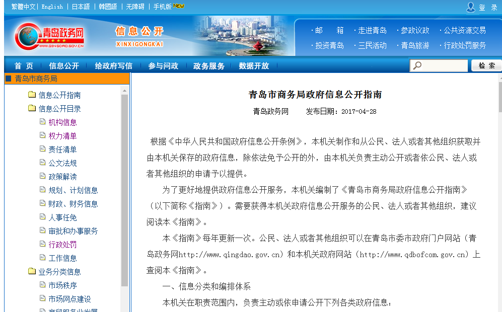 (三)定期更新公開(kāi)指南。及時(shí)調(diào)整更新政府信息公開(kāi)指南,拓展公開(kāi)范圍, 為切實(shí)保障人民群眾的知情權(quán)、參與權(quán)、監(jiān)督權(quán),積極做好目錄調(diào)整、內(nèi)容更新、信息發(fā)布的綜合協(xié)調(diào)、調(diào)度工作。新版目錄共包含共性目錄11個(gè)欄目,即機(jī)構(gòu)信息、權(quán)力清單、責(zé)任清單、公文法規(guī)、政策解讀、規(guī)劃計(jì)劃信息、財(cái)政財(cái)務(wù)信息、人事任免、審批和辦事服務(wù)、行政處罰、工作信息;完善了市場(chǎng)秩序、市場(chǎng)網(wǎng)點(diǎn)建設(shè)、商貿(mào)服務(wù)業(yè)、生活必需品供應(yīng)和“菜籃子”工程建設(shè)、對(duì)外貿(mào)易、國(guó)際服務(wù)貿(mào)易、機(jī)電和技術(shù)貿(mào)易、公平貿(mào)易與產(chǎn)業(yè)損害調(diào)查、外國(guó)外商投資和促進(jìn)、對(duì)外經(jīng)濟(jì)合作、電子商務(wù)工作等11個(gè)具有部門特色的個(gè)性化目錄。