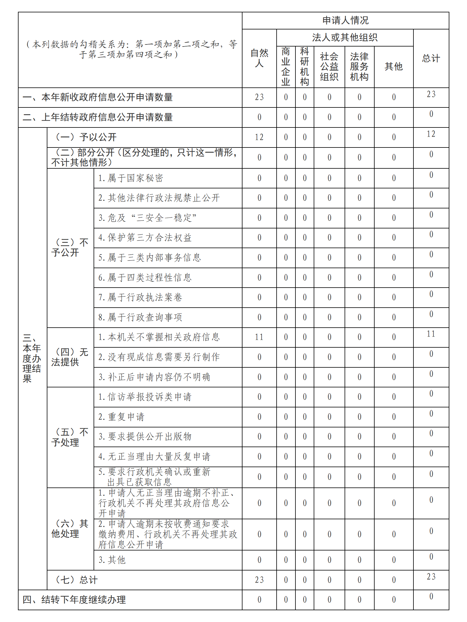 錨定公開(kāi)服務(wù)標(biāo)準(zhǔn),規(guī)范依申請(qǐng)公開(kāi)制度標(biāo)準(zhǔn),細(xì)化完善登記、審核、辦理、答復(fù)、歸檔等工作環(huán)節(jié),優(yōu)化辦理流程,更好滿足申請(qǐng)人對(duì)統(tǒng)計(jì)信息的個(gè)性化合理需求。全年受理依申請(qǐng)公開(kāi)23件,全部依法依規(guī)進(jìn)行答復(fù)。其中,屬于主動(dòng)公開(kāi)范圍6件,同意公開(kāi)答復(fù)6件,非本機(jī)關(guān)信息11件,不予公開(kāi)0件,均實(shí)現(xiàn)100%按期受理、100%按期辦理,群眾滿意率達(dá)100%。