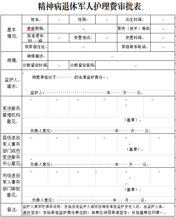 ? ? ? ? ? 2.《精神病退休軍人護(hù)理費審批表》