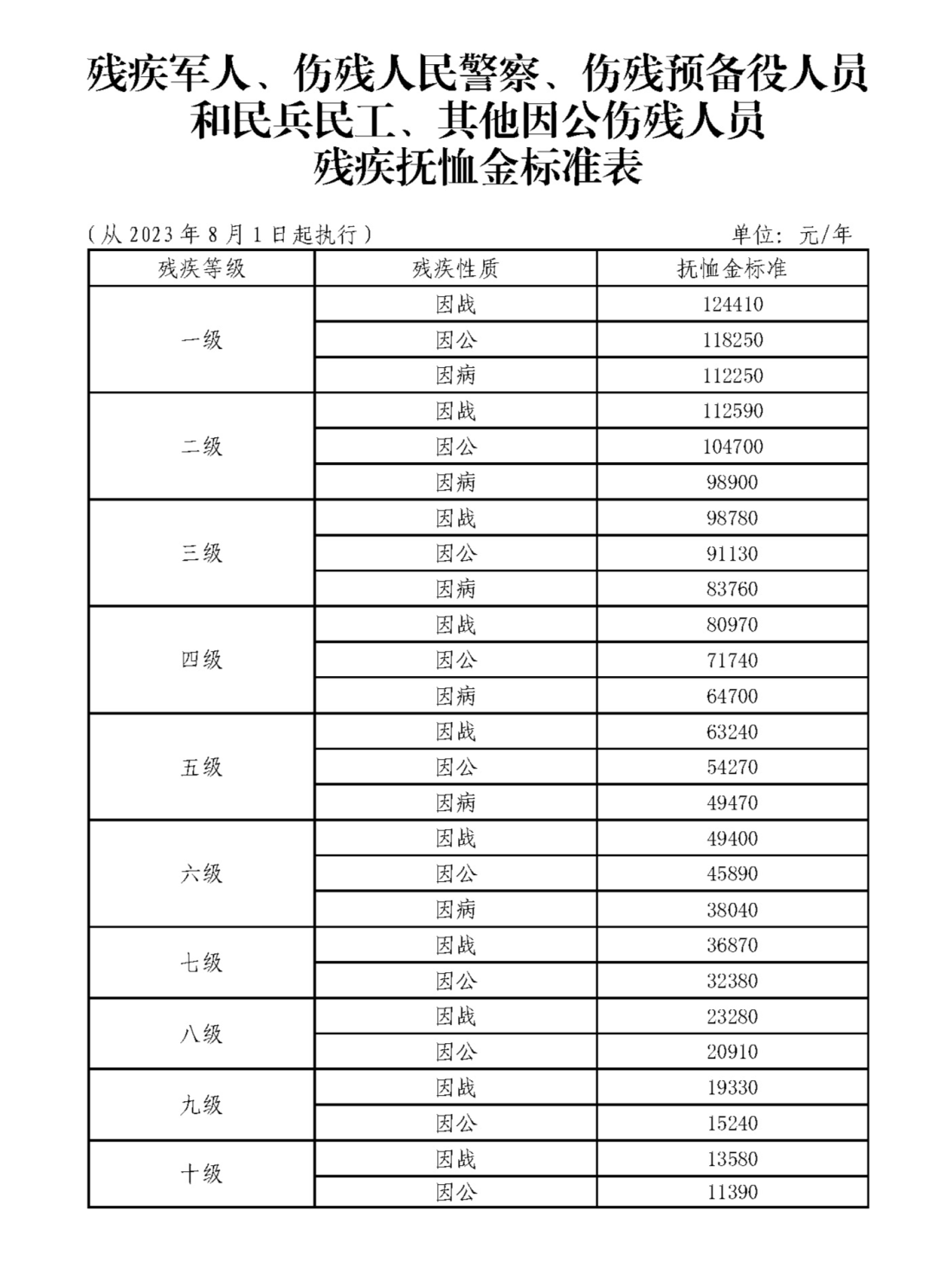 殘疾軍人(含傷殘人民警察、傷殘預(yù)備役人員和民兵民工、其他因公傷殘人員)的殘疾撫恤金標(biāo)準(zhǔn),按照國(guó)家、山東省的統(tǒng)一標(biāo)準(zhǔn)落實(shí)。