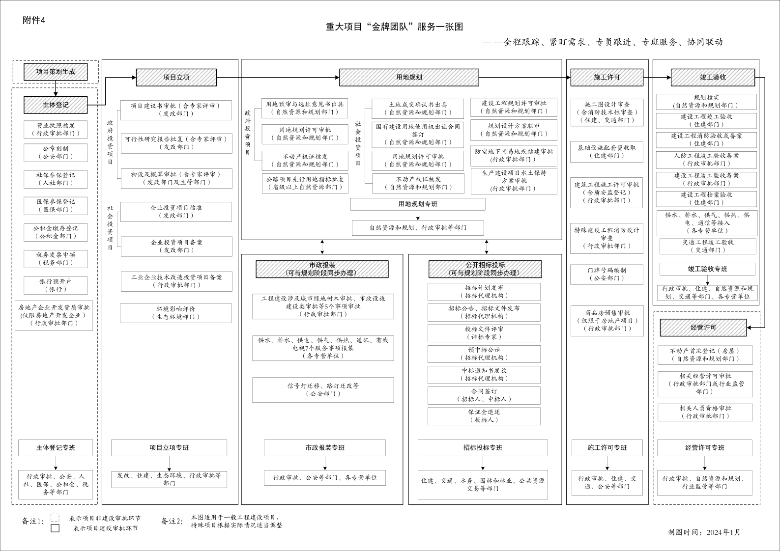 (一)全程跟蹤,在健全重大項(xiàng)目服務(wù)鏈條上“務(wù)實(shí)功”。把好服務(wù)重大項(xiàng)目的“第一公里”和“最后一公里”,全面梳理重大項(xiàng)目全流程審批事項(xiàng),優(yōu)化重大項(xiàng)目“主體登記、項(xiàng)目立項(xiàng)、用地規(guī)劃、招標(biāo)投標(biāo)、市政報(bào)裝、施工許可、竣工驗(yàn)收、經(jīng)營許可”等八個階段,制定重大項(xiàng)目從“準(zhǔn)入”到“準(zhǔn)營”全鏈條“重大項(xiàng)目‘金牌團(tuán)隊(duì)’服務(wù)一張圖”。建立完善“跟蹤回訪機(jī)制”,密切跟蹤全鏈條審批服務(wù)進(jìn)展情況,確保各項(xiàng)服務(wù)取得實(shí)際成效。強(qiáng)化“‘金牌團(tuán)隊(duì)’審批服務(wù)一張圖”線上平臺應(yīng)用,構(gòu)建市、區(qū)兩級服務(wù)平臺,實(shí)現(xiàn)“金牌團(tuán)隊(duì)”服務(wù)重大項(xiàng)目全覆蓋。積極與“智慧低空”一體化共享平臺對接,在線獲取全景影像和現(xiàn)場照片,提高重大項(xiàng)目實(shí)際進(jìn)展情況調(diào)度效率。