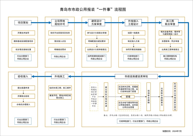 6.市政設(shè)施建設(shè)類審批階段。涉及外線工程的,市政公用企業(yè)或施工單位按照規(guī)定提出行政許可申請,行政審批部門組織相關(guān)部門開展聯(lián)合審批。市政設(shè)施接入涉及的審批環(huán)節(jié)全面推行全程網(wǎng)辦、并聯(lián)審批、告知承諾。外線工程涉及公路(包含國省道、農(nóng)村公路)的,按照涉路工程施工審批程序辦理。