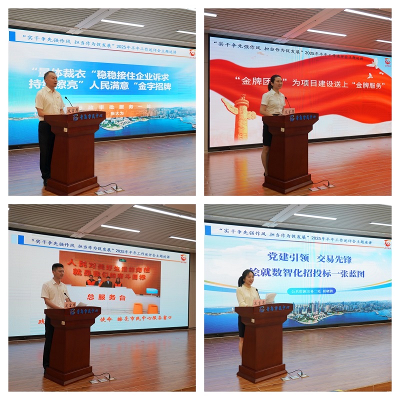 會(huì)上,局機(jī)關(guān)和中心各處室負(fù)責(zé)人逐一上臺(tái)做盤點(diǎn)、講不足、談打算,4名在營商環(huán)境一線的業(yè)務(wù)骨干分別圍繞持續(xù)擦亮全國“人民滿意的公務(wù)員”工作室招牌、“金牌團(tuán)隊(duì)”的“金牌服務(wù)”、踐行市民中心“第一排面”使命、繪就數(shù)智化招投標(biāo)一張藍(lán)圖等主題展開述講,談?wù)J識(shí)、亮做法、講收獲。
