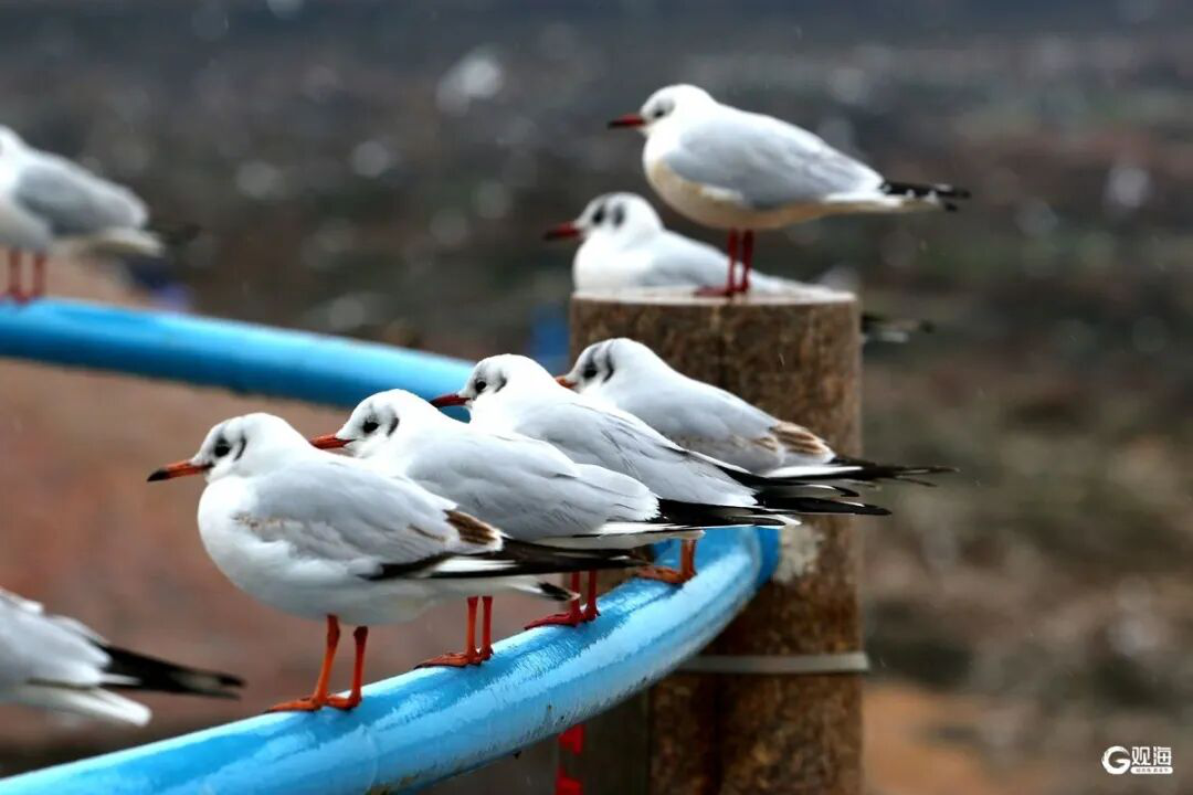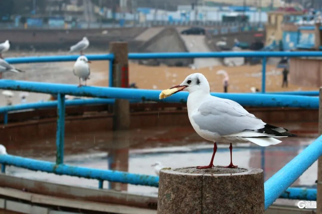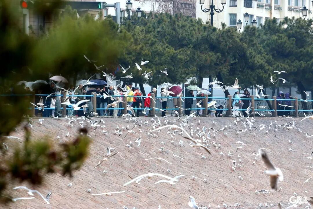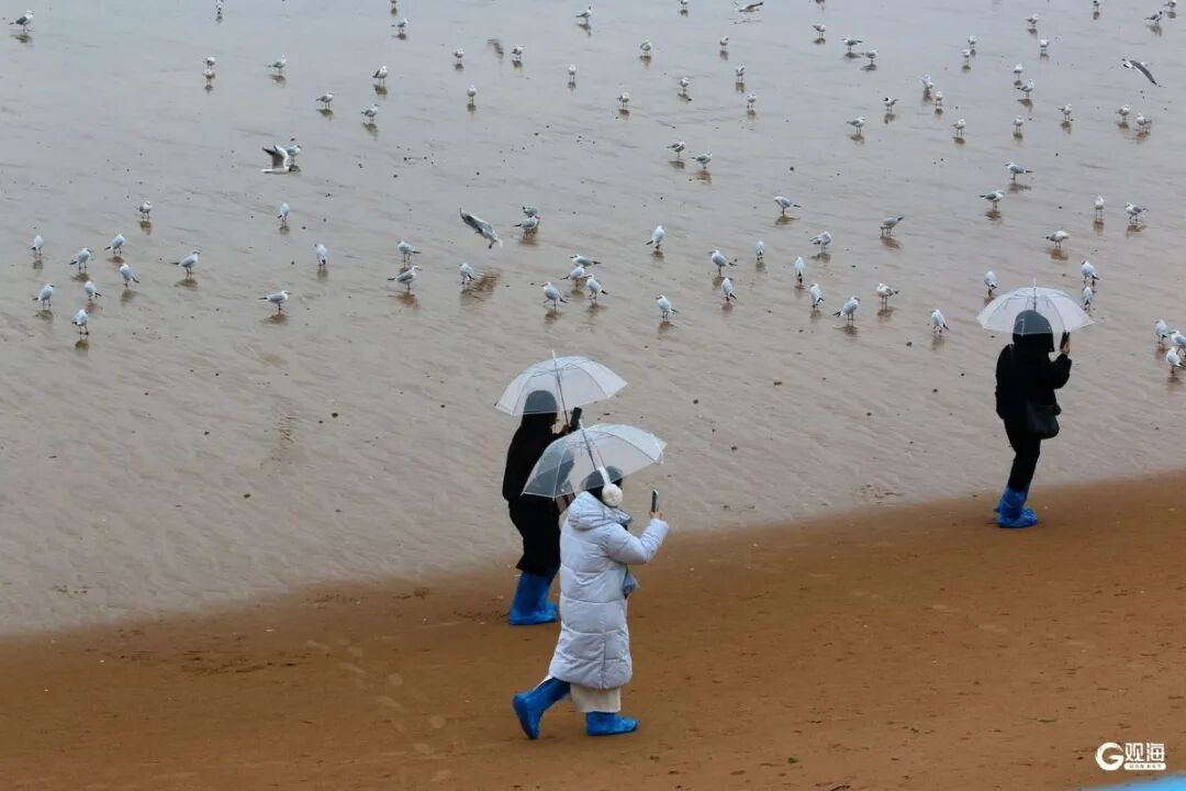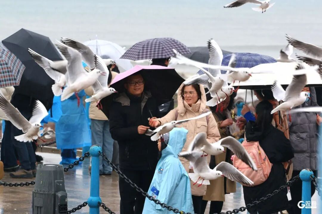 萬千海鷗迎風(fēng)起舞,白羽劃破雨幕,時(shí)而低空盤旋、掠水輕鳴,時(shí)而振翅高飛、逐浪嬉戲,與粼粼波光相映成畫。游客們撐傘駐足,或抬手投喂、或舉機(jī)定格,笑聲、鷗鳴與潮聲交織,熱鬧又治愈。
