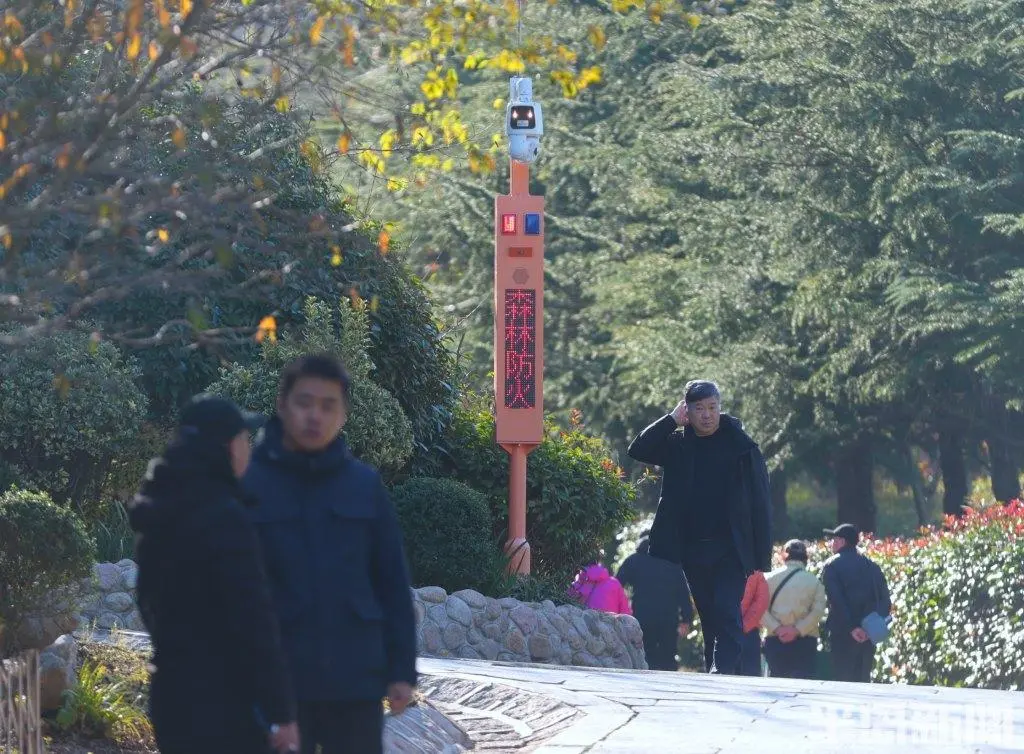 圖片在浮山森林公園各個(gè)入口處、山路上,隨處可以監(jiān)控探頭、電子顯示屏和防火宣傳幅等,提醒登山人員配合做好防火工作