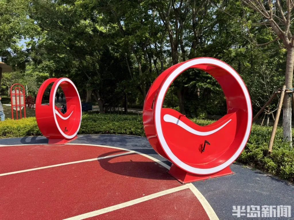 紅色線條將所有的健身器材串聯(lián),又劃分出不同的功能區(qū)。有的區(qū)域做了一個(gè)紅色的圓形遮陽棚,棚下配有桌椅供市民游客休閑;有的區(qū)域配備沙袋、壺鈴、吊環(huán)等健身器材,成為鍛煉健身的絕佳去處;還有的區(qū)域有秋千、漫步機(jī)等等,這些游樂設(shè)施受到全齡段的喜愛。