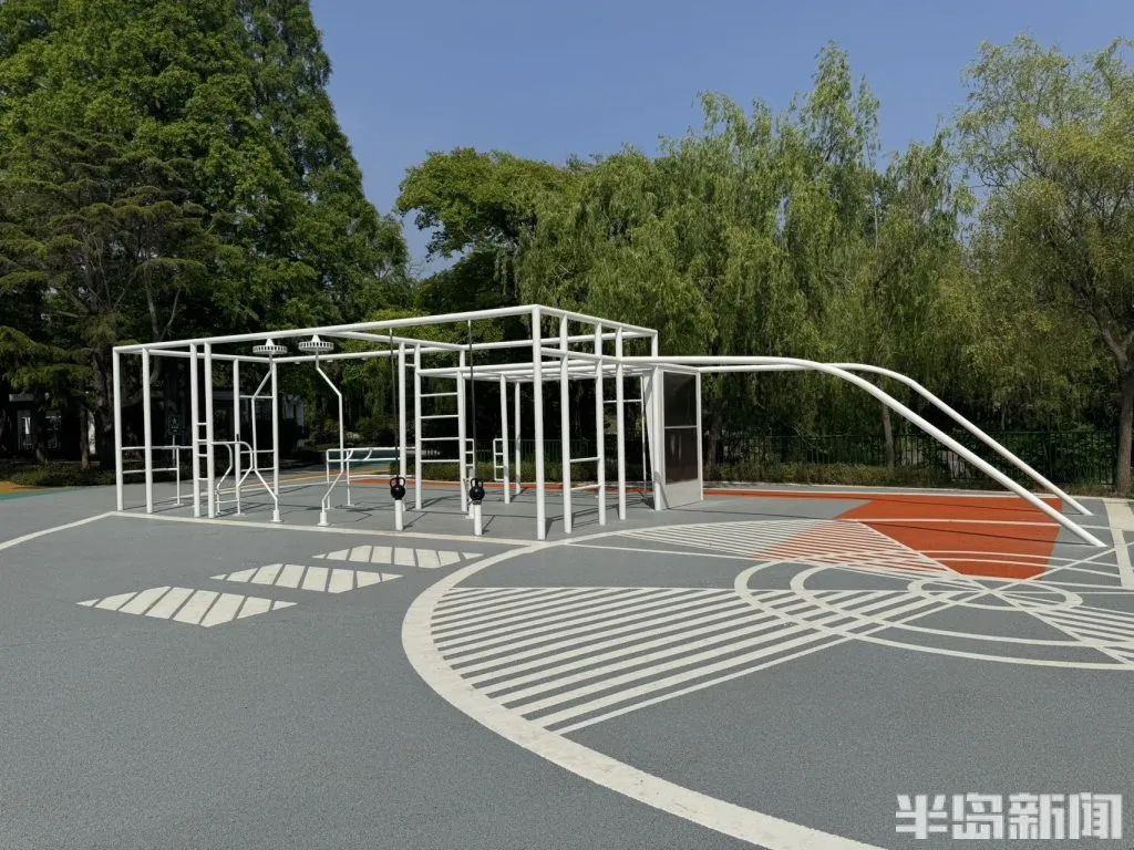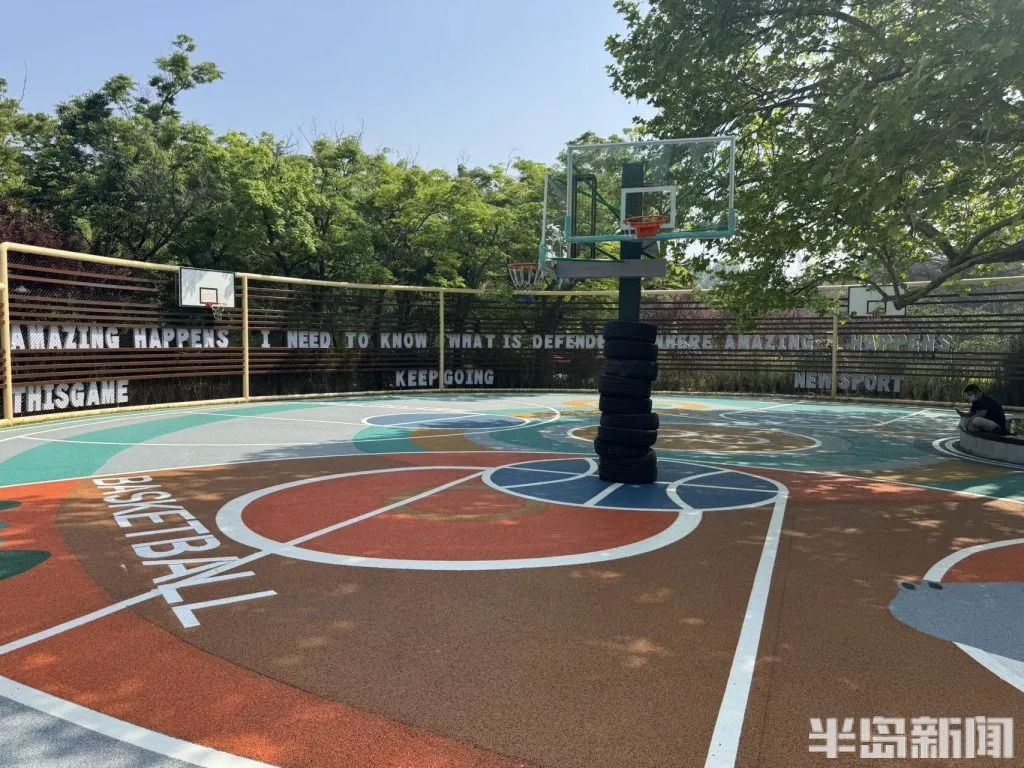 在孫中山雕像旁邊還有一處健身場地穿上了“新衣”,這里名為“能量加油站”。原來地面是水泥和磚,改造后重新鋪設(shè)了透水石,更換了籃筐,還增設(shè)一處健身設(shè)施,讓原本老舊的健身場地?zé)ㄈ灰恍拢幽贻p化,功能也更加完善。