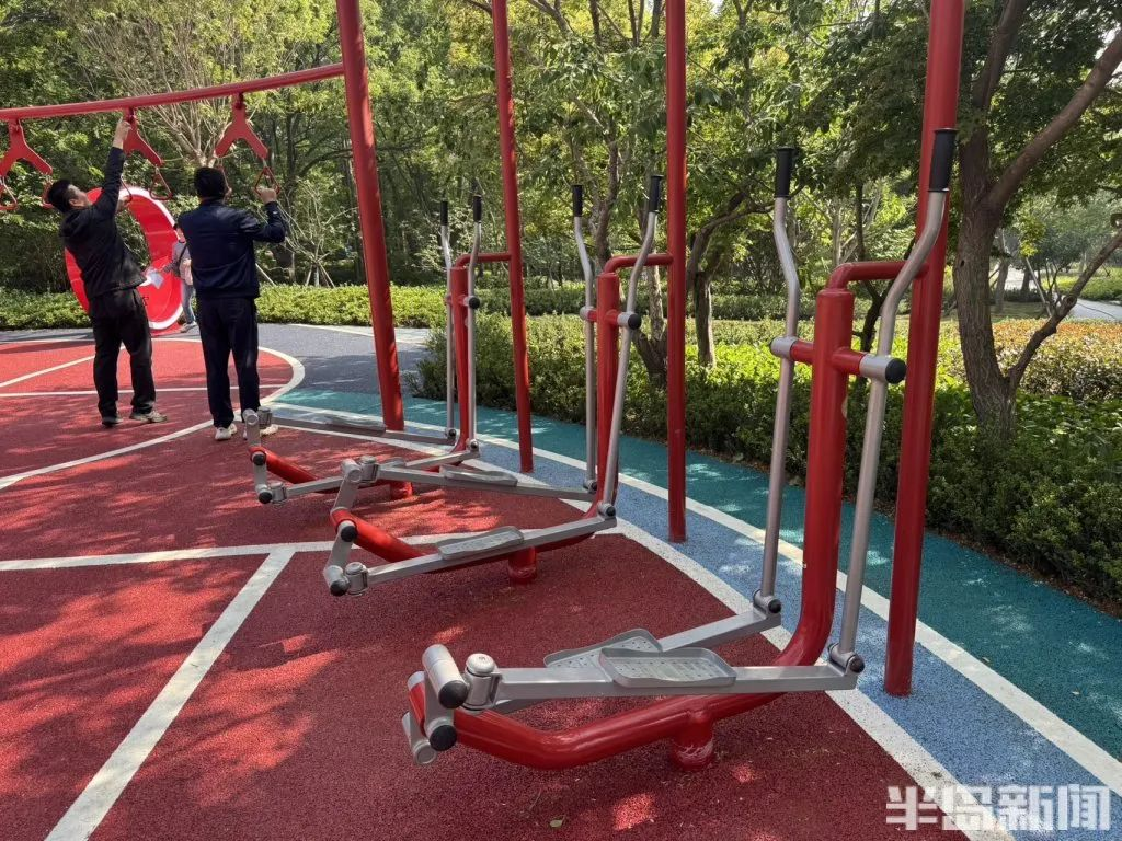 從中山公園南門入園,走過噴泉東側(cè)的小石橋,沿著太平山綠道繼續(xù)向東走,不遠(yuǎn)處就是以紅色為主色調(diào)的新增健身區(qū)。