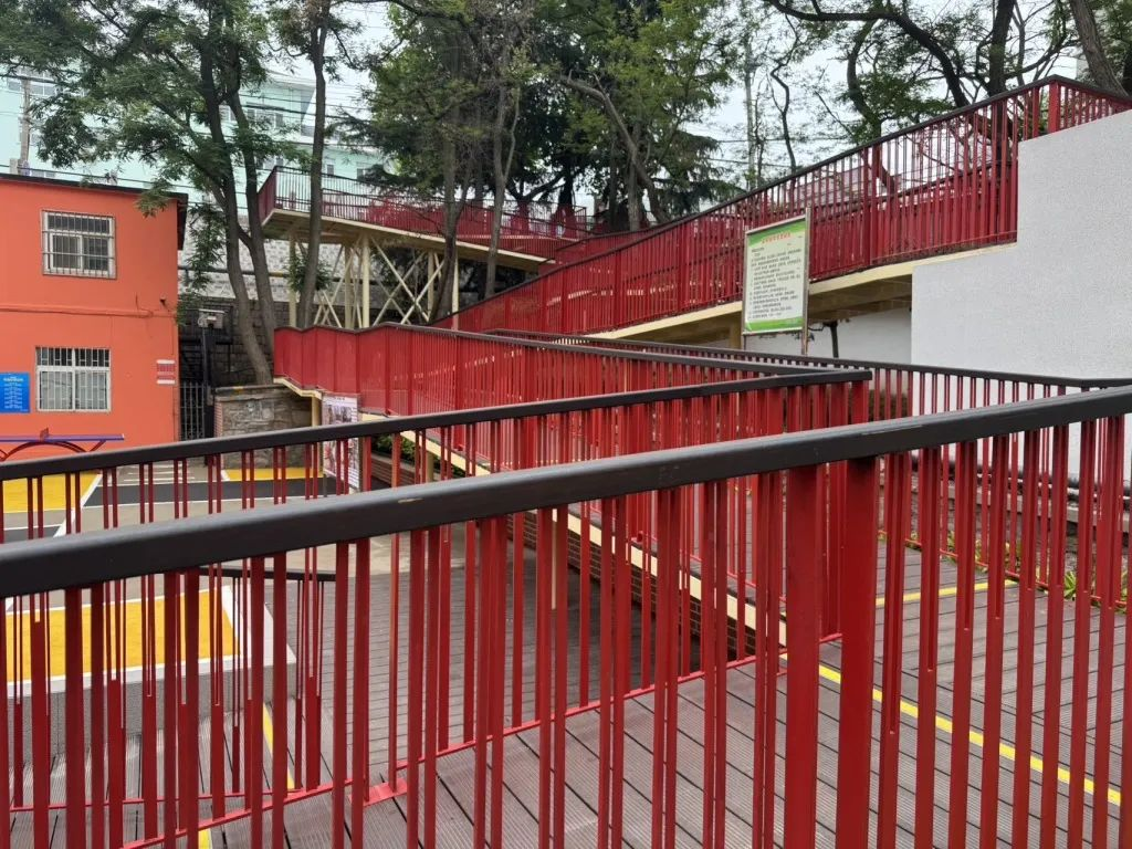 下車后,先映入眼簾的是一條蜿蜒而下的紅色廊橋。“這里整體地勢高差較大,高差最大處約8米,周邊居民交通極不方便,安全隱患較大。所以設(shè)計方案重新梳理交通動線,滿足適老化要求,增加無障礙廊橋?!惫ぷ魅藛T介紹。