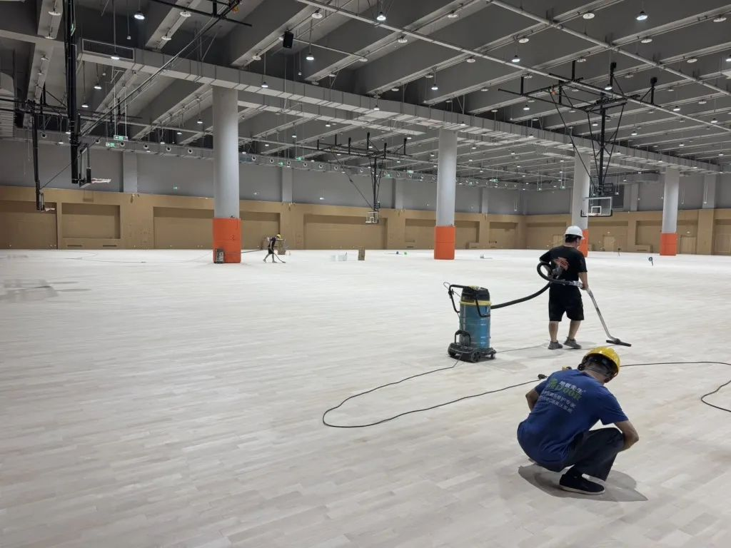在6月5日記者曾來到浮山全民健身中心進行探訪,如今這里又有了新的變化。地上部分足球場已經(jīng)鋪設(shè)了草皮。負一層的籃球場里,覆蓋的地膜已經(jīng)撤掉,工人們正在上漆并打磨地面?!盎@球框可以用電動遙控升上去,后期還會在場地增設(shè)電動座椅,不使用時可以一鍵收起,不占用場地。這片籃球場最多可容納500人觀賽,東北角還用聲光電技術(shù)打造裸眼立體感效果,這也是從奧運會黑科技中取得的靈感?!惫ぷ魅藛T介紹。