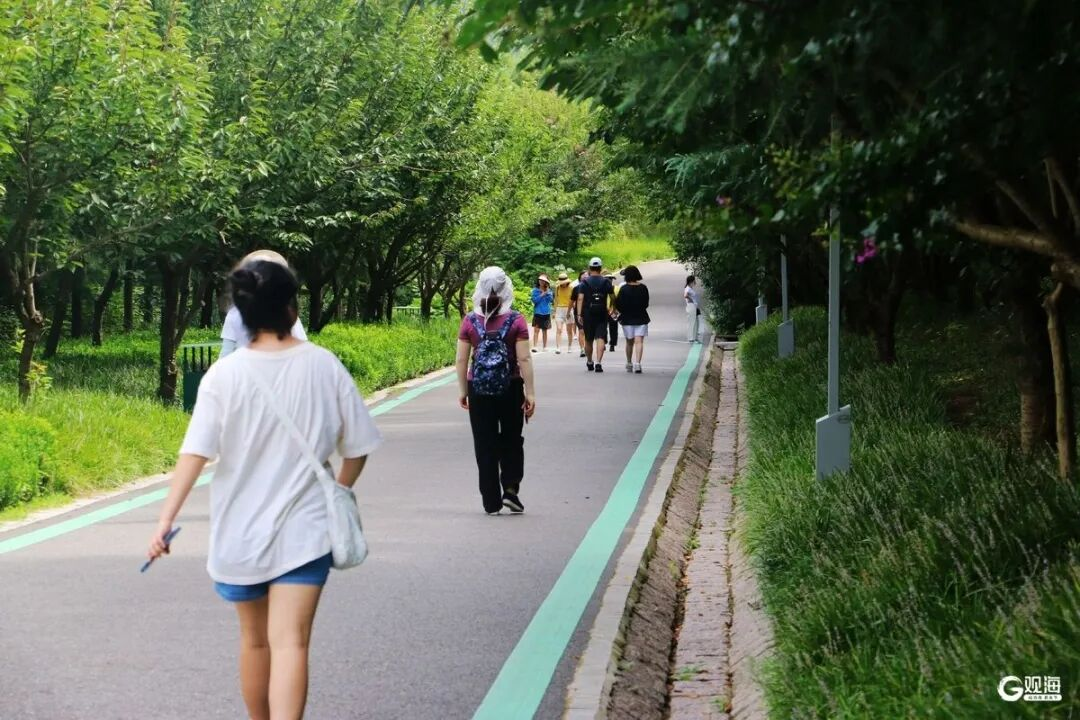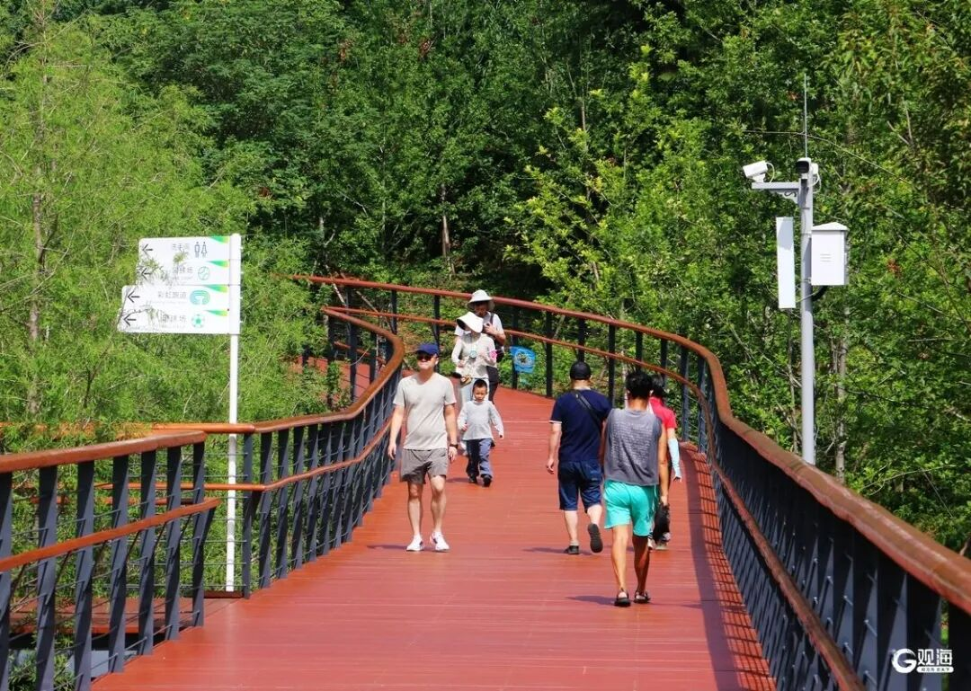 蜿蜒的木棧道依山而建,行人緩步而上,腳下木板輕響,抬頭便是層疊綠蔭;綠道上,有人騎著單車(chē)穿梭,衣角被風(fēng)掀起,笑聲落滿(mǎn)林間;草坪空地上,孩子們嬉鬧奔跑,幾頂帳篷搭在其間,親朋好友們閑談暢聊;不遠(yuǎn)處游樂(lè)場(chǎng)里,滿(mǎn)是孩子的雀躍呼喊,家長(zhǎng)們坐在長(zhǎng)椅上,笑著看孩子撒歡。