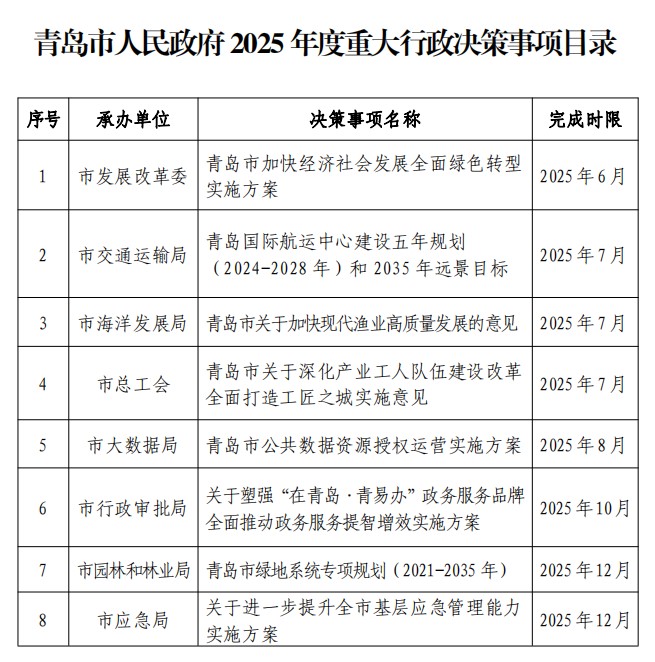 為規(guī)范重大行政決策程序,促進(jìn)政府科學(xué)、民主、依法決策,提高決策質(zhì)量和效率,按照《青島市重大行政決策程序規(guī)定》(市政府令第271號(hào))要求,經(jīng)市委、市政府研究同意,市政府辦公廳組織市政府各部門(mén)對(duì)2025年重點(diǎn)工作事項(xiàng)進(jìn)行了梳理,篩選出具有基礎(chǔ)性、全局性和影響面廣的8項(xiàng)決策事項(xiàng),決定納入青島市人民政府2025年度重大行政決策事項(xiàng)范圍,實(shí)行目錄清單管理。各有關(guān)部門(mén)和單位要嚴(yán)格按照公眾參與、專(zhuān)家論證、風(fēng)險(xiǎn)評(píng)估、合法性審查的法定程序開(kāi)展前期工作,并適時(shí)提交市政府常務(wù)會(huì)議審議。