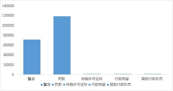 2.一個處罰決定書中包含一種行政處罰的,計入相應(yīng)的行政處罰類別欄中;包含兩種以上行政處罰類別的,計入最重的行政處罰類別欄中,不重復(fù)統(tǒng)計。如“沒收違法所得,并處罰款”,計入“沒收違法所得”類別;并處明確類別的行政處罰和其他行政處罰的,計入明確類別的行政處罰,如“處罰款,并處其他行政處罰”,計入“罰款”類別。行政處罰類別從輕到重的順序:(1)警告,(2)通報批評,(3)罰款,(4)沒收違法所得,(5)沒收非法財物,(6)暫扣許可證件,(7)降低資質(zhì)等級,(8)吊銷許可證件,(9)限制開展生產(chǎn)經(jīng)營活動,(10)責(zé)令停產(chǎn)停業(yè),(11)責(zé)令關(guān)閉,(12)限制從業(yè),(13)行政拘留。
